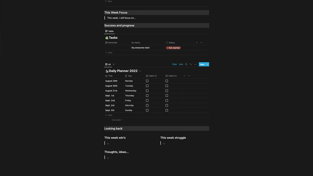 You'll get the full template, with goals tracking, habit tracking, tasks list and weekly dashboard.